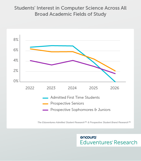 Among today’s sophomores, only 1% express interest in Computer Science, a sharp contrast to 4% two years ago. The pipeline is narrowing at every stage of the funnel. Perceptions of instability — driven by automation narratives and industry volatility — may be shaping how students evaluate the field. By the time institutions engage students, fewer are considering Computer Science in the first place.